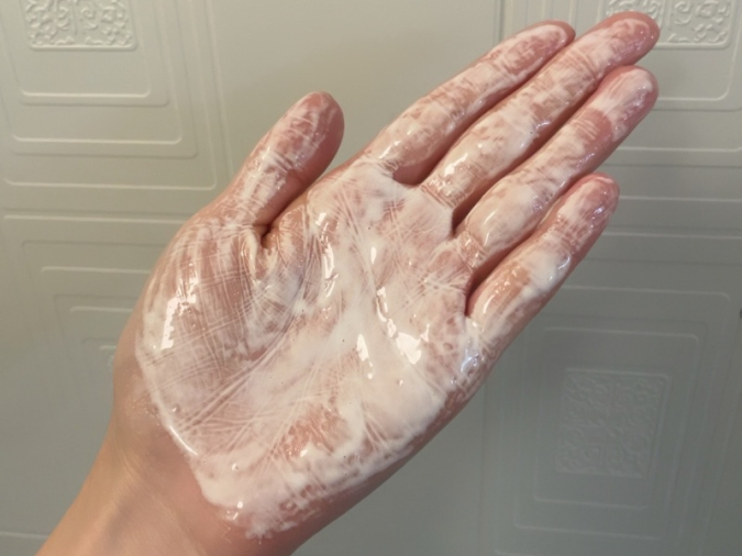 少量ずつぬるま湯を手にとり、オイルを白く濁らせながら洗い流します。